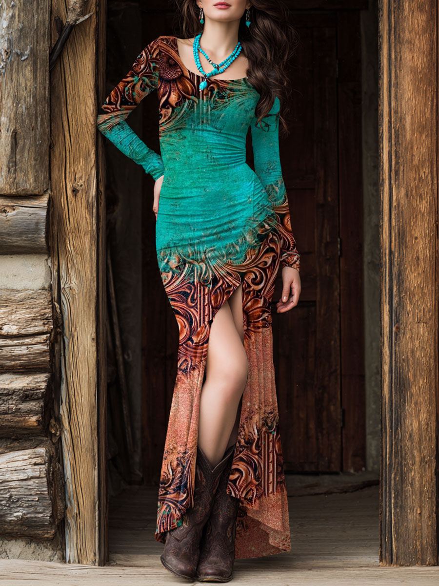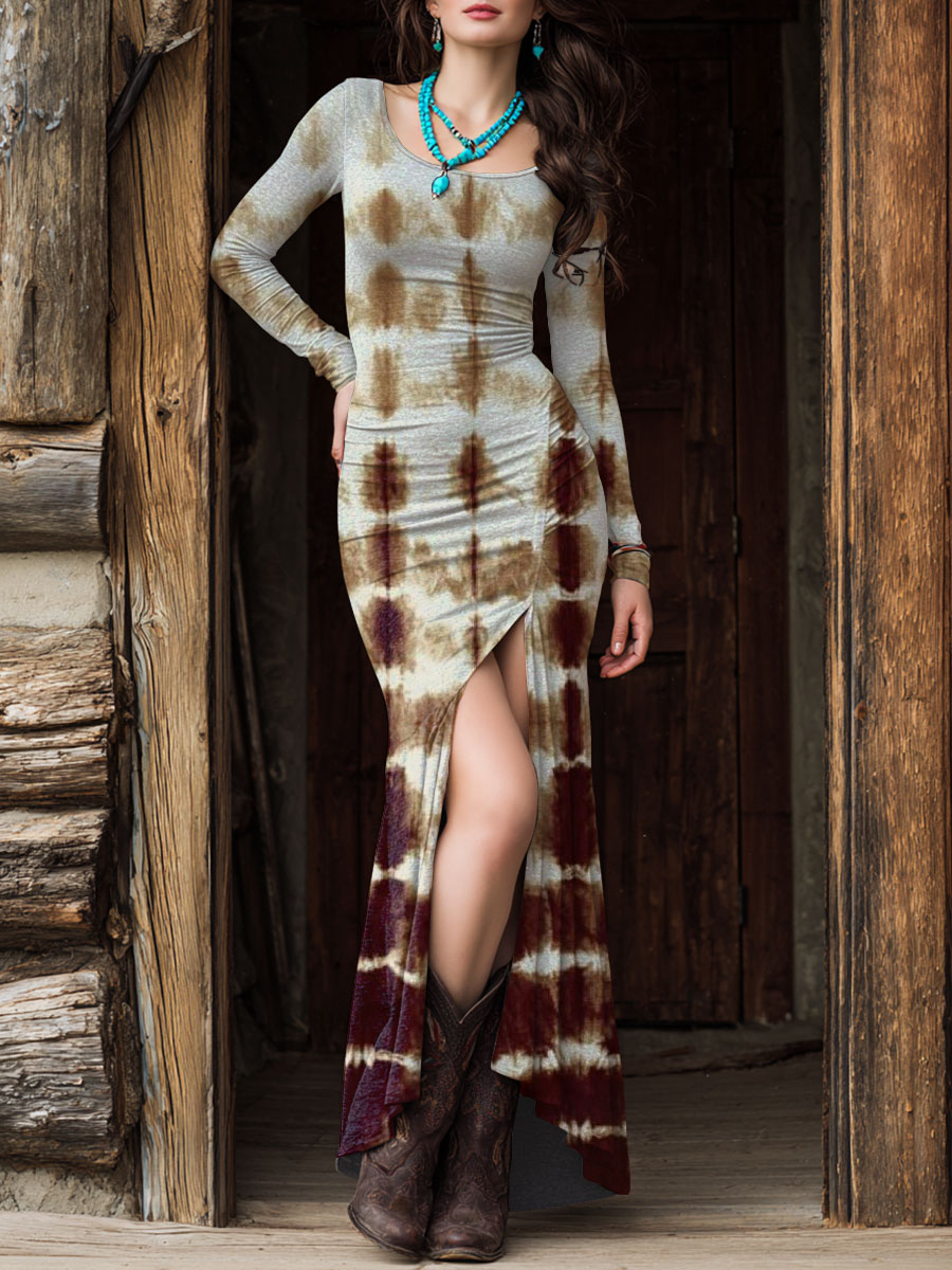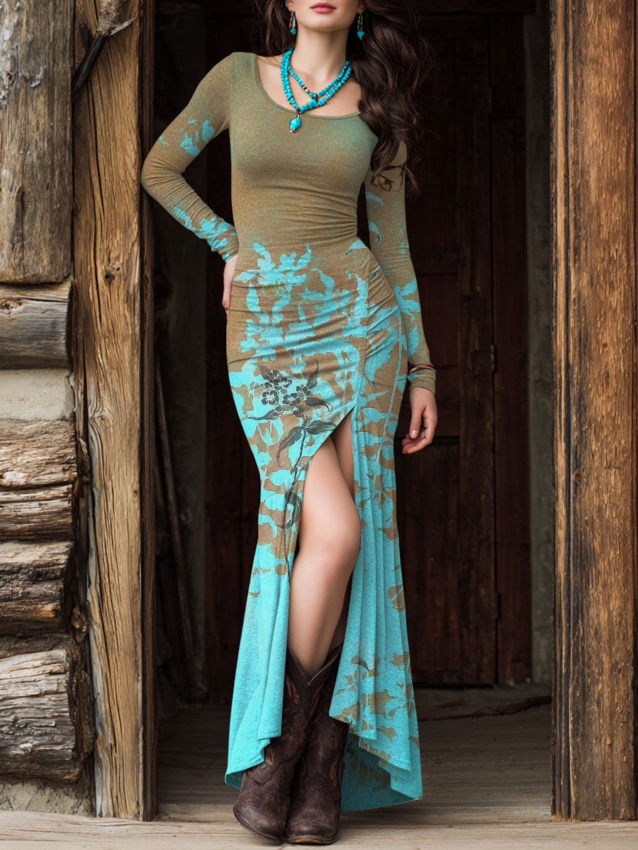 Women's Western Print Slit Round Neck High Elastic Comfortable Soft Dress