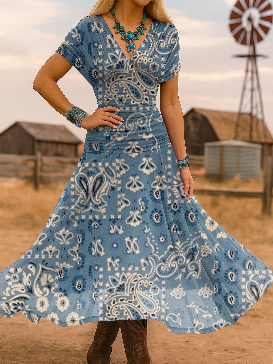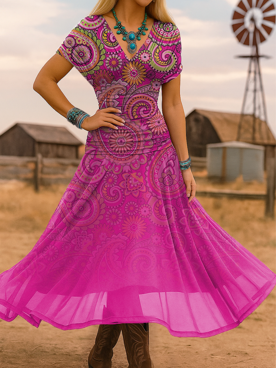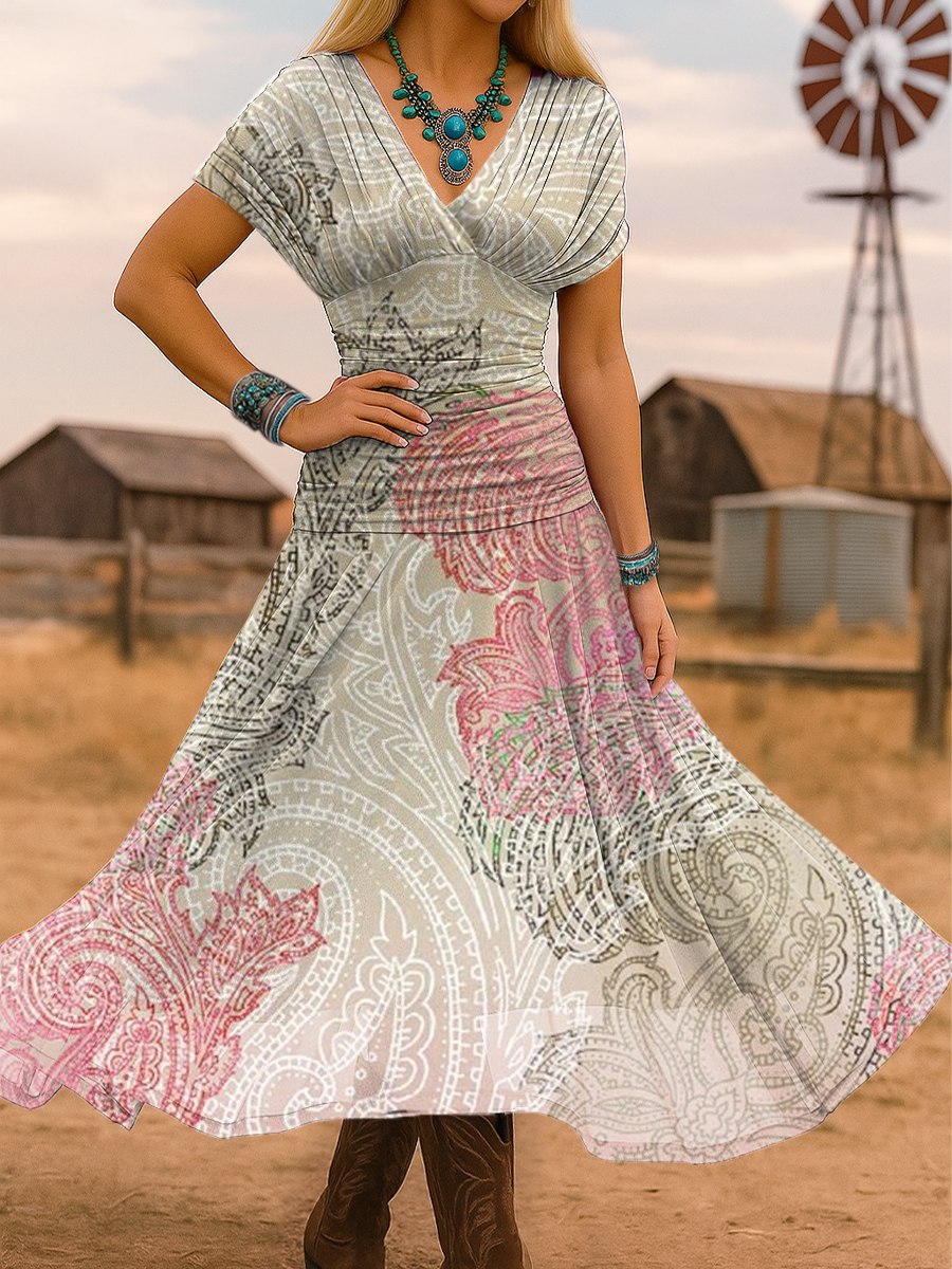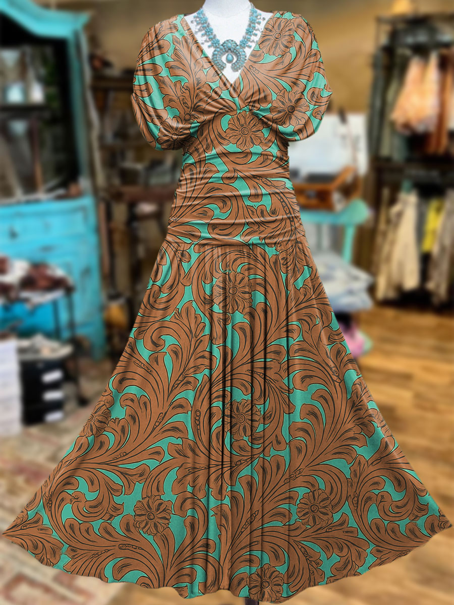 Women's Western Print Slit Round Neck High Elastic Comfortable Soft Dress