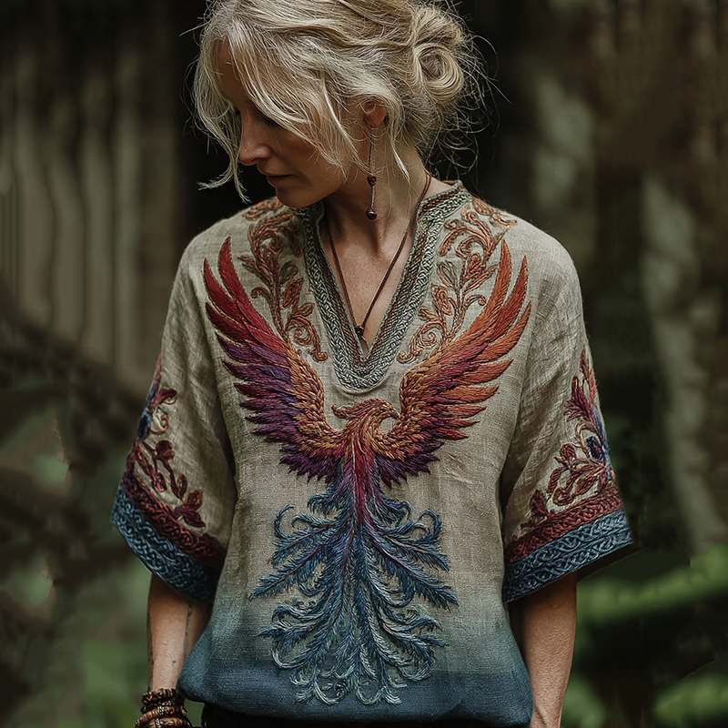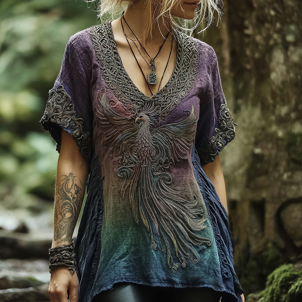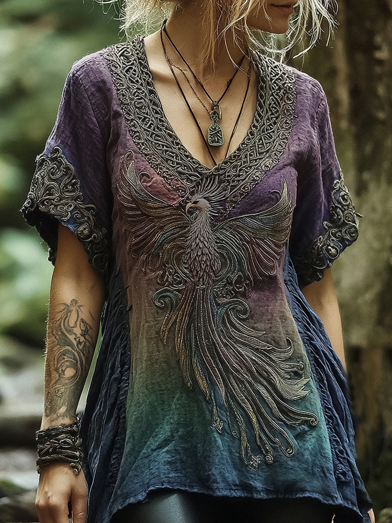 Women's Viking Celtic Knot Phoenix Totem Gradient Linen Shirt