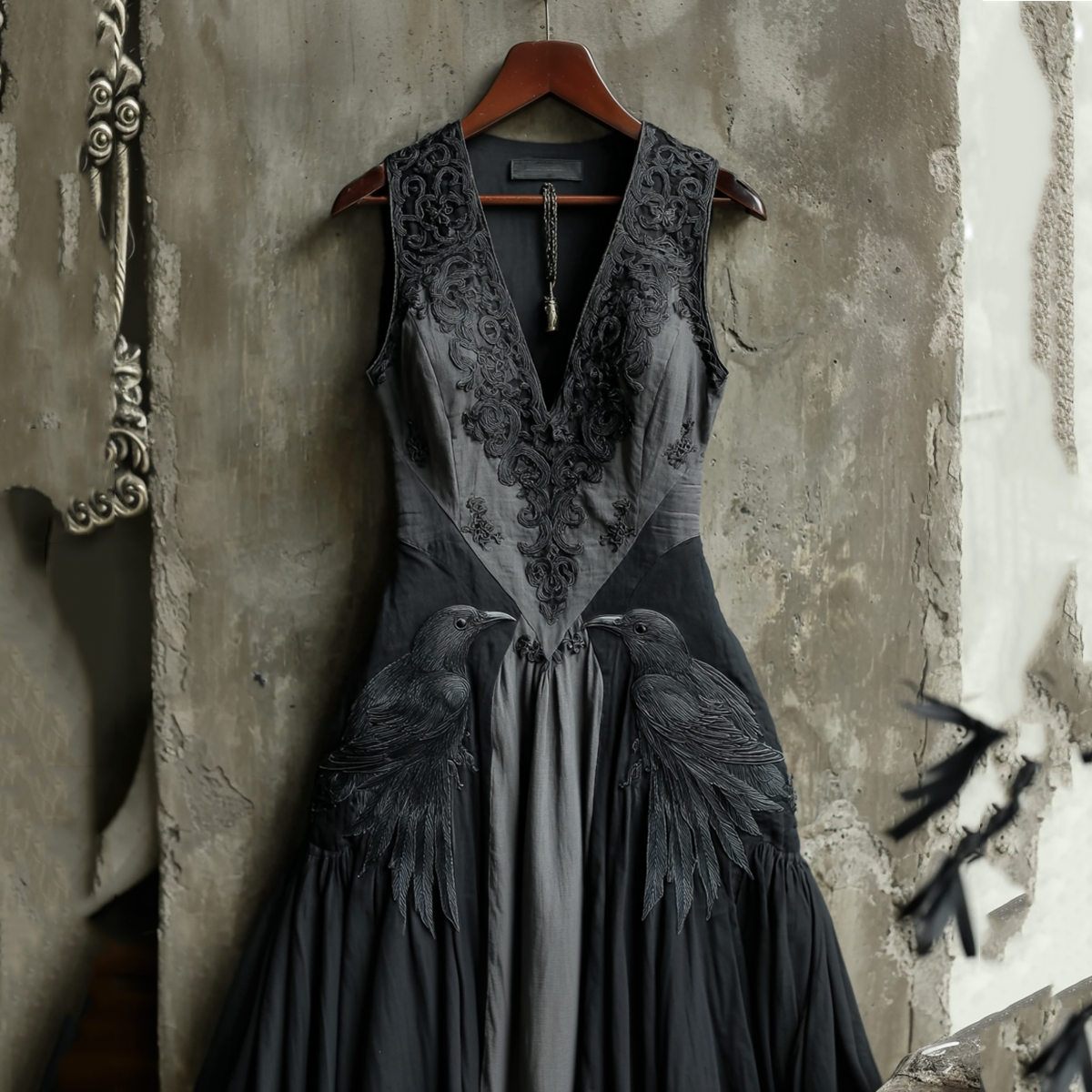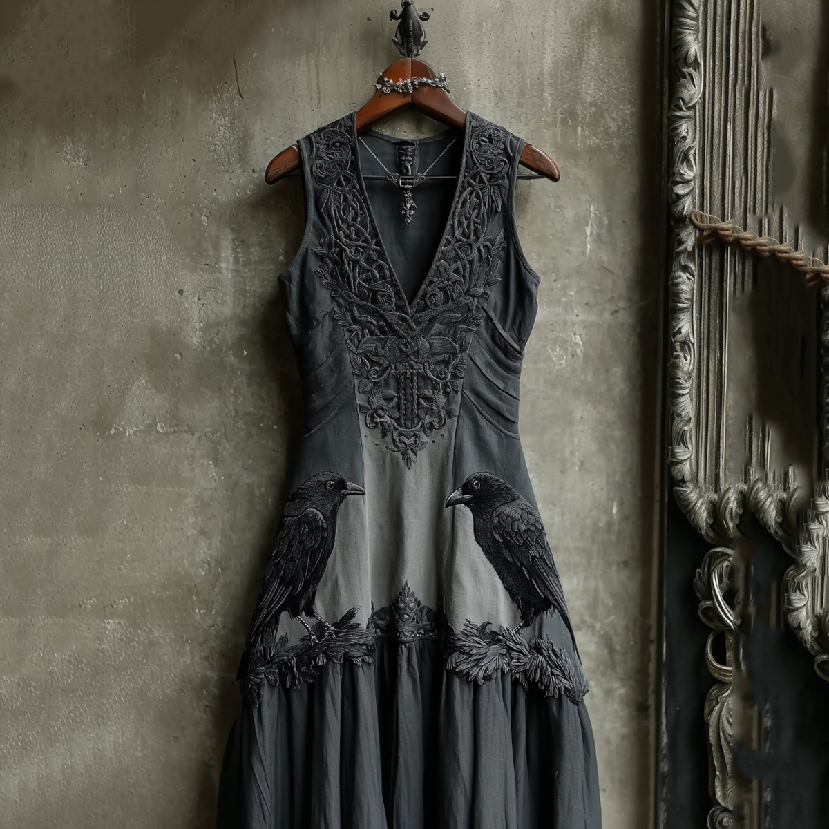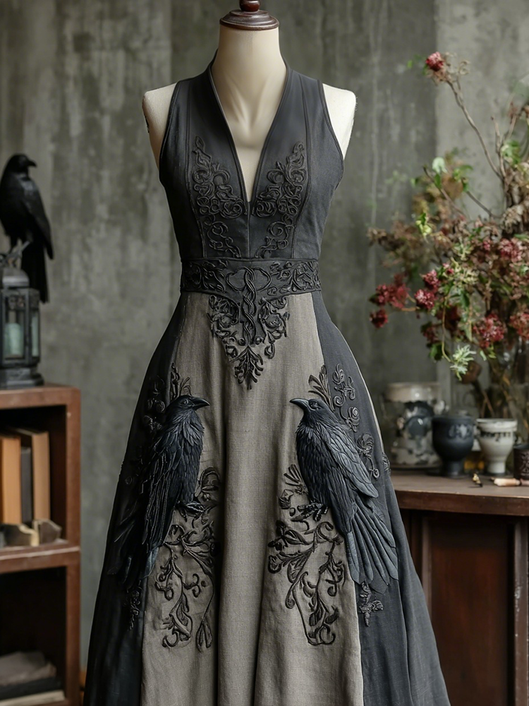 Women's Vintage Viking Rose And Raven Art Linen Gothic Dress