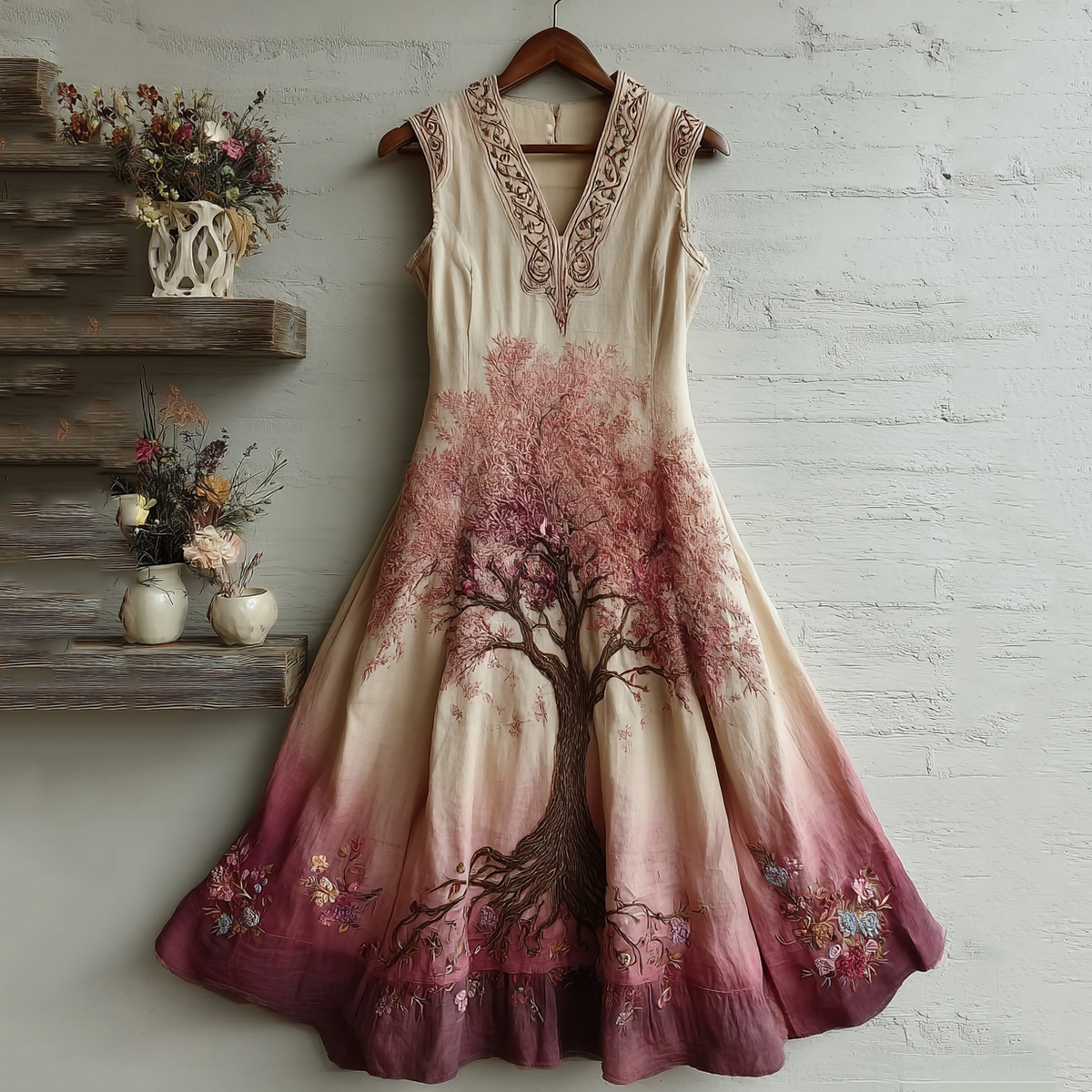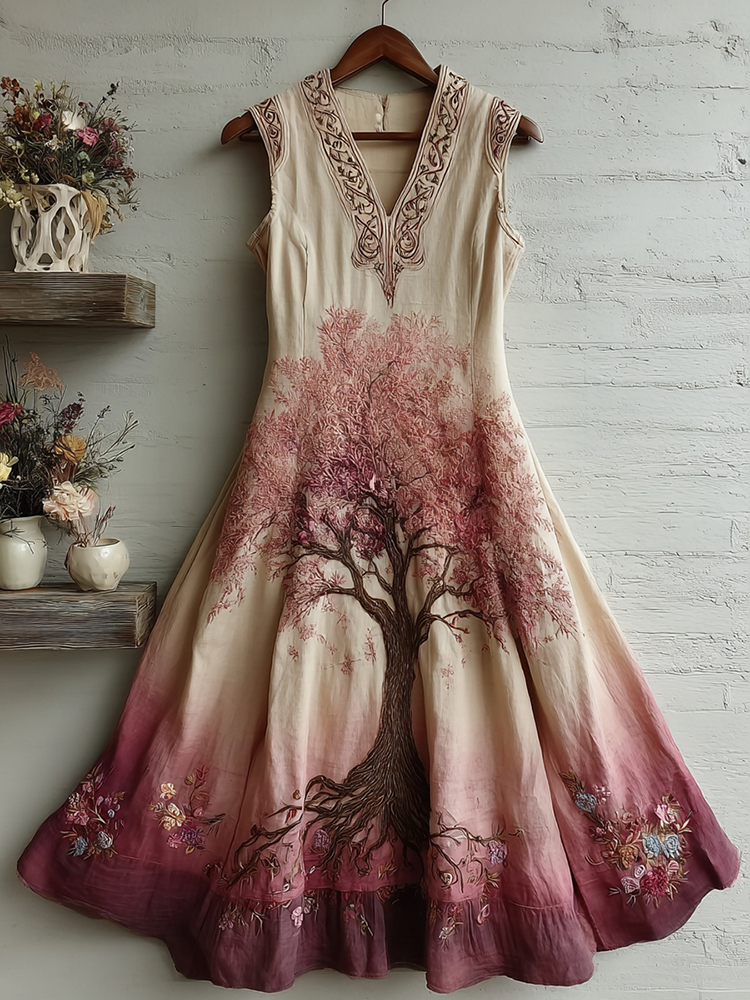 Pink Celtic Tree Of Life Embroidered Linen Midi Tank Dress
