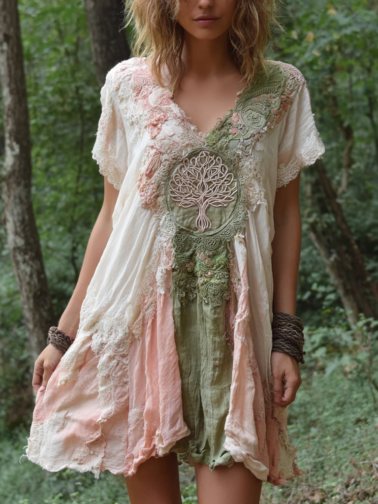 Women's Retro Tree Of Life Art Patchwork Short Sleeve Dress