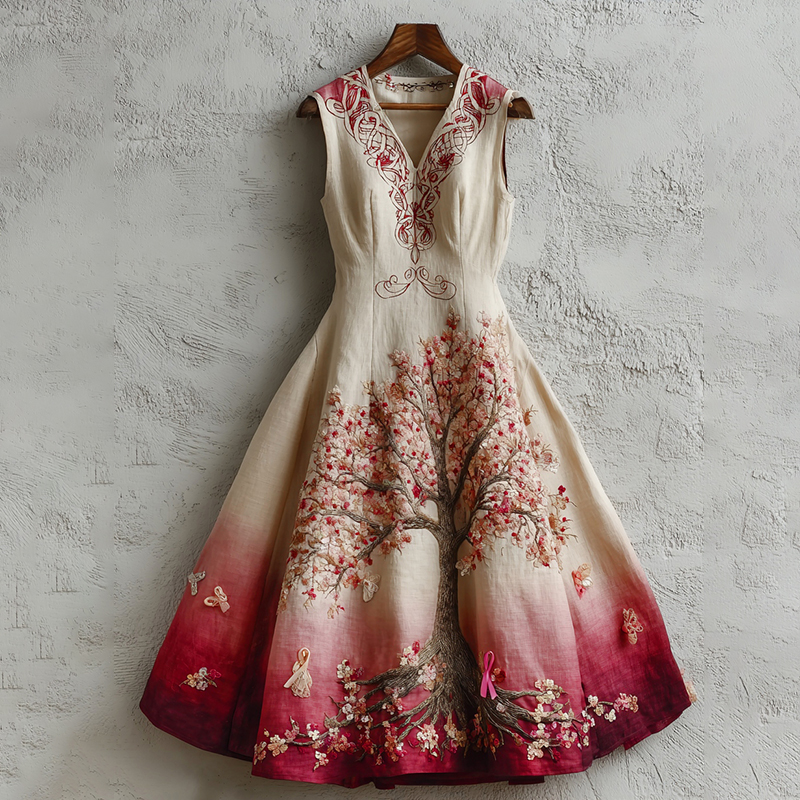 Women's Tree Of Life Pink Ribbon Embroidery Tank Maxi Dress
