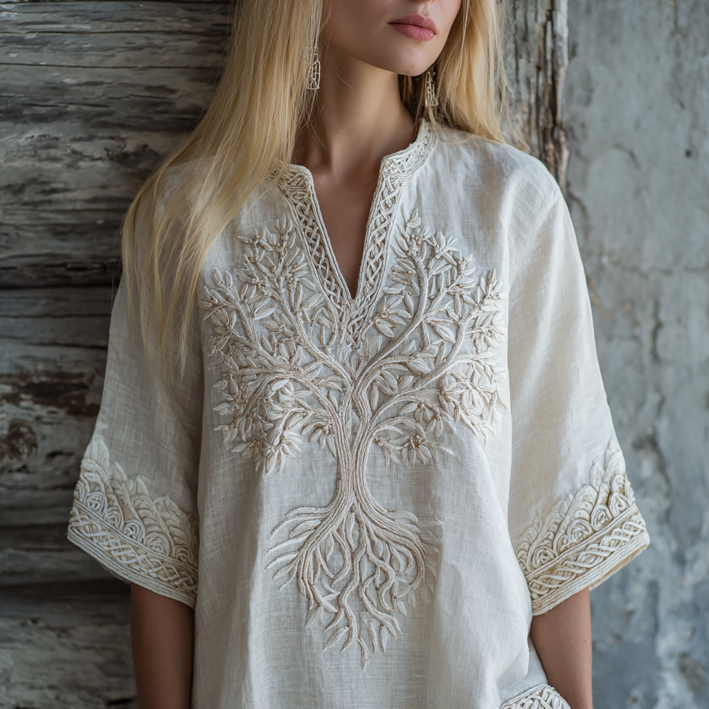 Vintage Viking Life Of Tree Celtic Embroidered Linen Blend Shirt