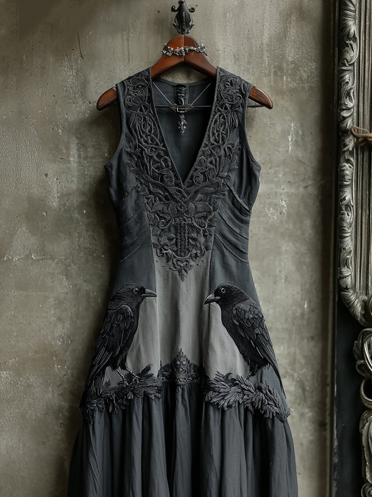 Women's Vintage Viking Raven Celtic Knot Linen Maxi Dress