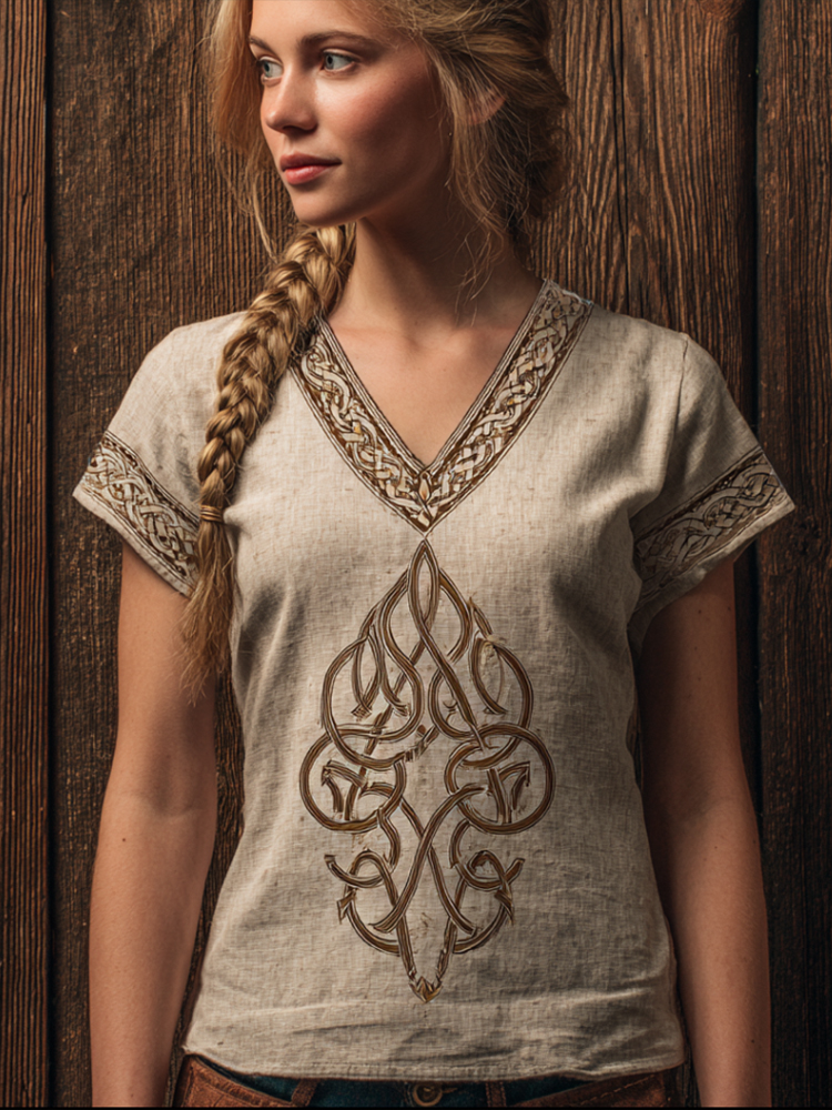 Viking Embroidery Vintage V-neck Short-sleeved Shirt
