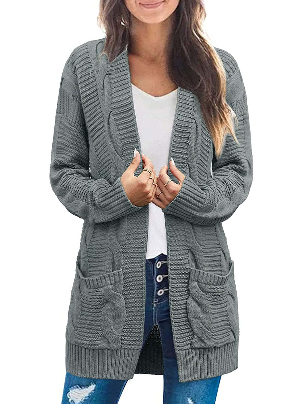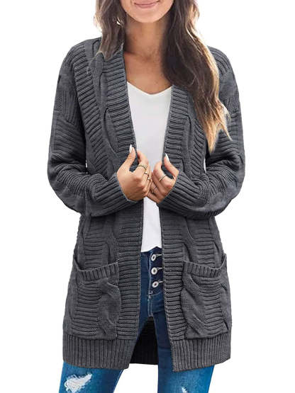 - This classic cardigan is here waiting to be added to your wardrobe! The chunky cable knit fabric is so warm and cozy! And it features an open front, long sleeves, and timeless solid color, which could be a perfect piece to layer over any outfit this fall and winter! Throw it over a chic graphic tee, jeans, and boots for a trendy casual look in 2022!