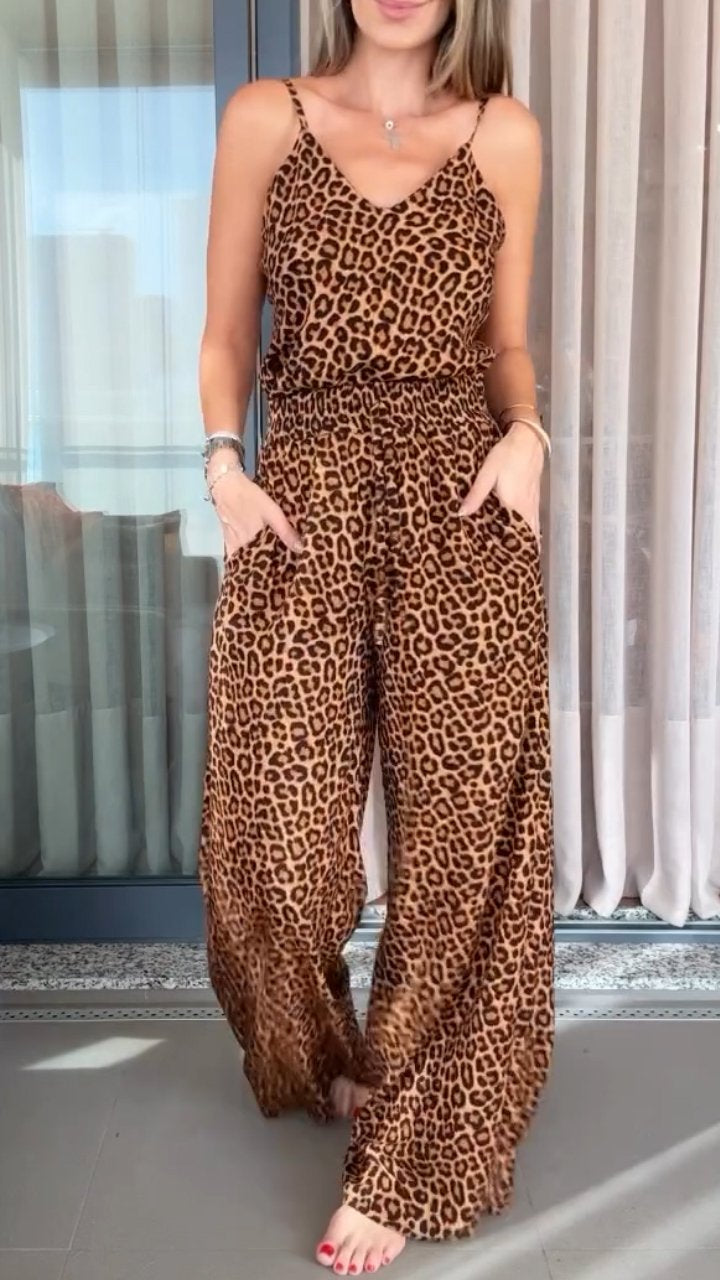 Casual V-neck Leopard Print Suspender Two-piece Suit