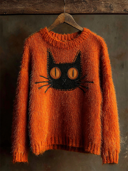 Halloween Black Cat Patchwork Cozy Fuzzy Sweater