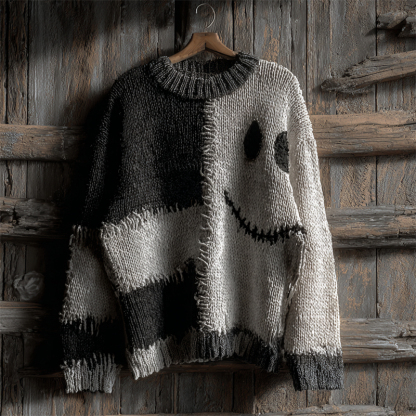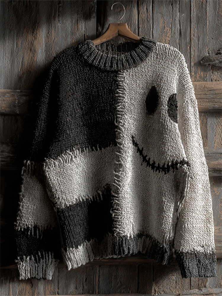 Halloween Spooky Face Contrast Patchwork Cozy Knit Sweater