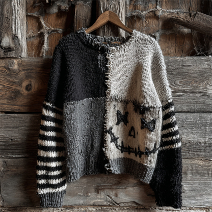 Halloween Stitched Face Contrast Patchwork Cozy Knit Sweater