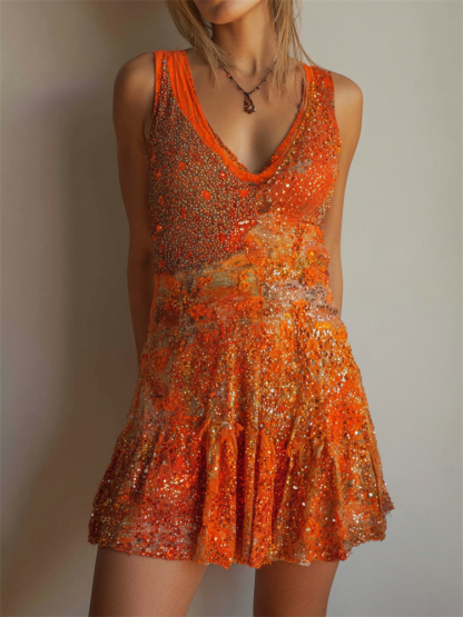 Orange Glitter Sequins Flowy Wide Skirted Mini Dress