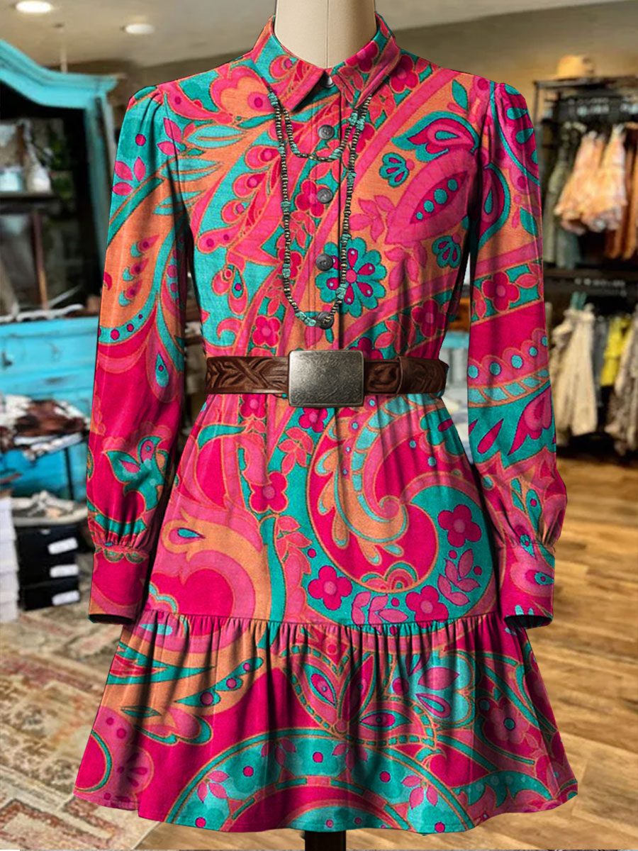 Paisley Art Print Casual Long Sleeved Lapel Dress