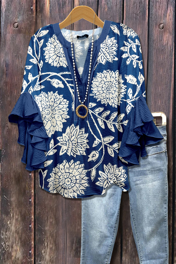 Retro Floral Print V-Neck Ruffle Sleeve Top