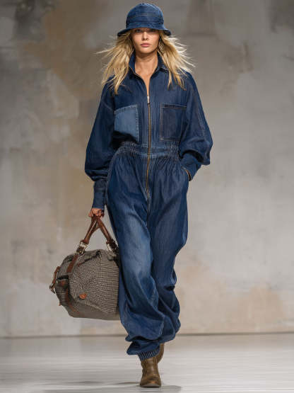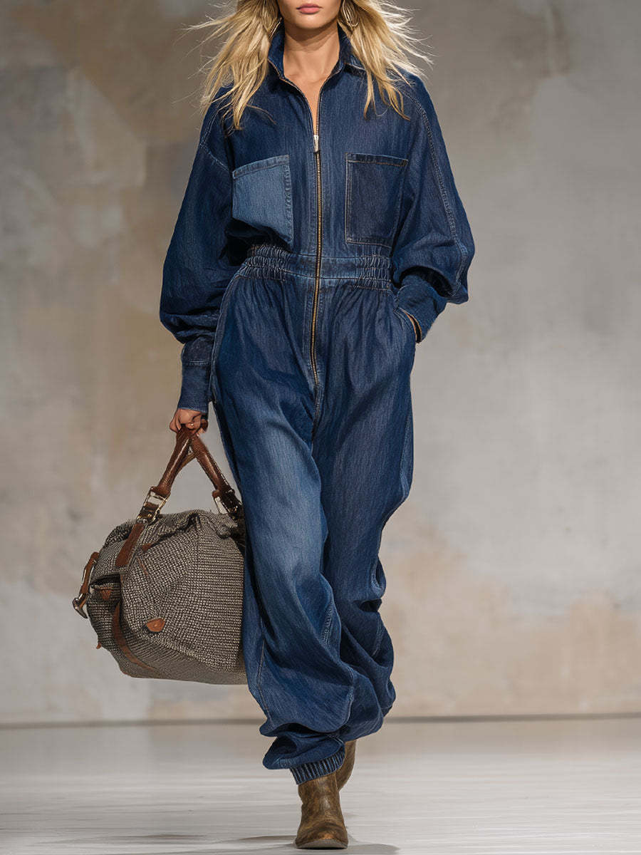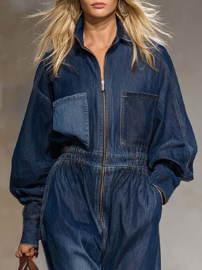 Retro-style Collared Multi-pocket Zippered Denim Jumpsuit