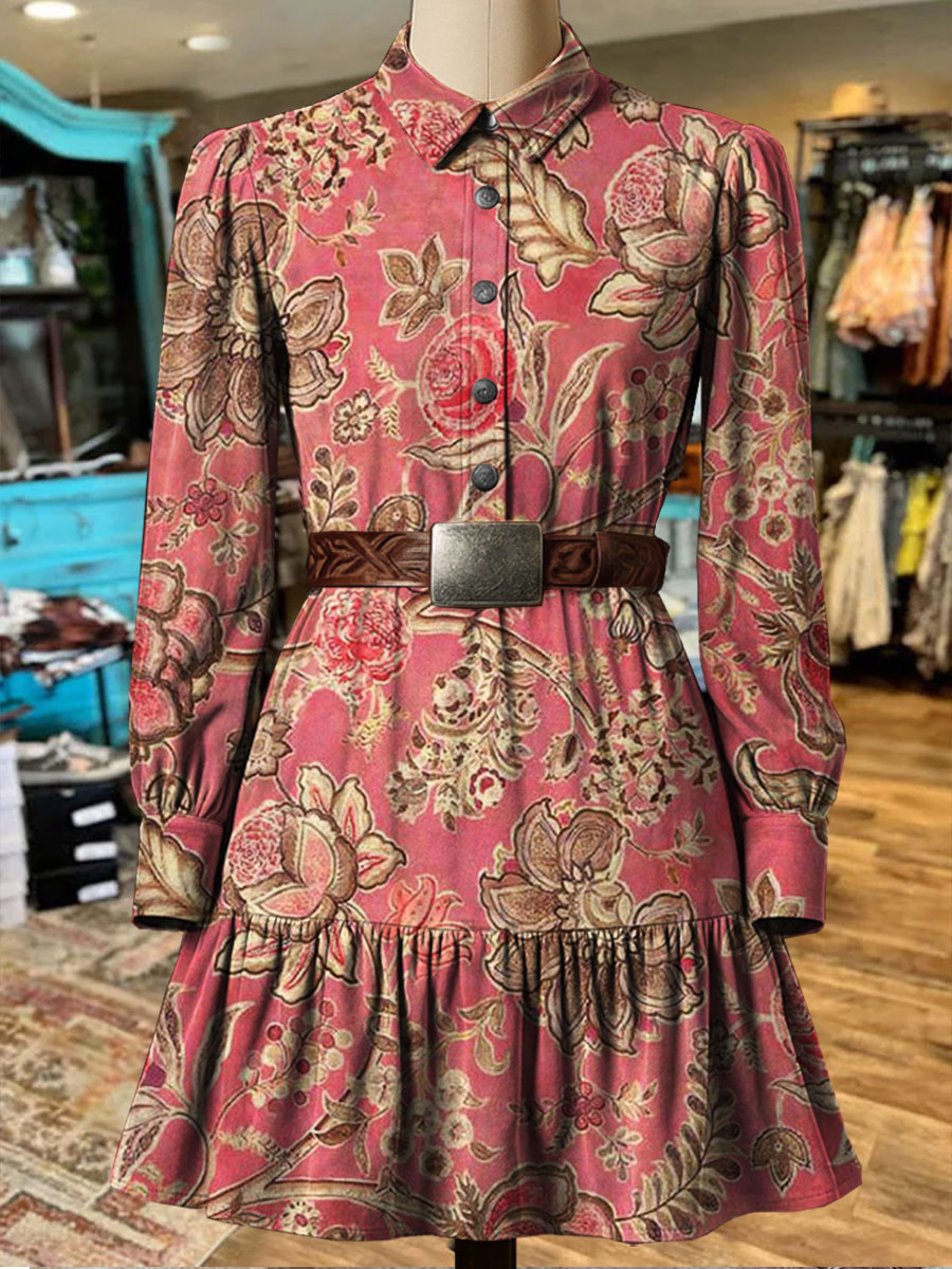 Vintage Floral Print Casual Long Sleeved Lapel Dress