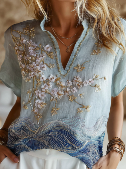 Vintage Gradient Marble Texture And Cherry Blossoms Pattern Linen T-shirt
