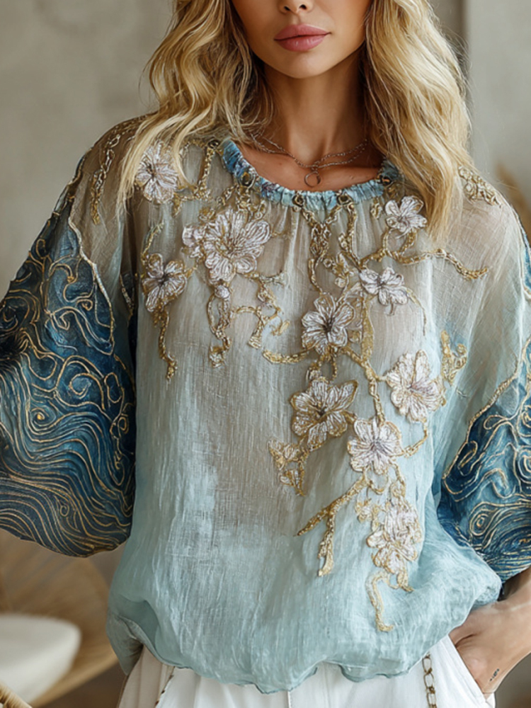 Vintage Gradient Marble Texture With Cherry Blossoms Pattern Art Linen Shirts