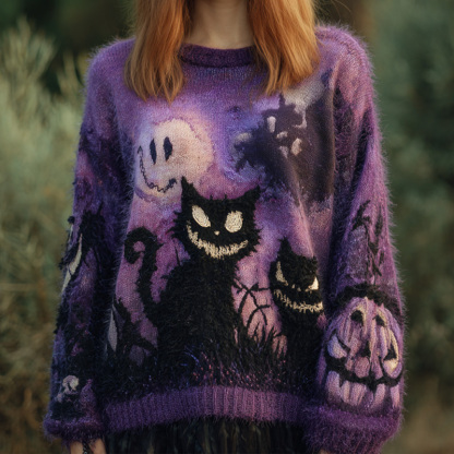 Women's Casual Vintage Halloween Black Cat Embroidered Sweater
