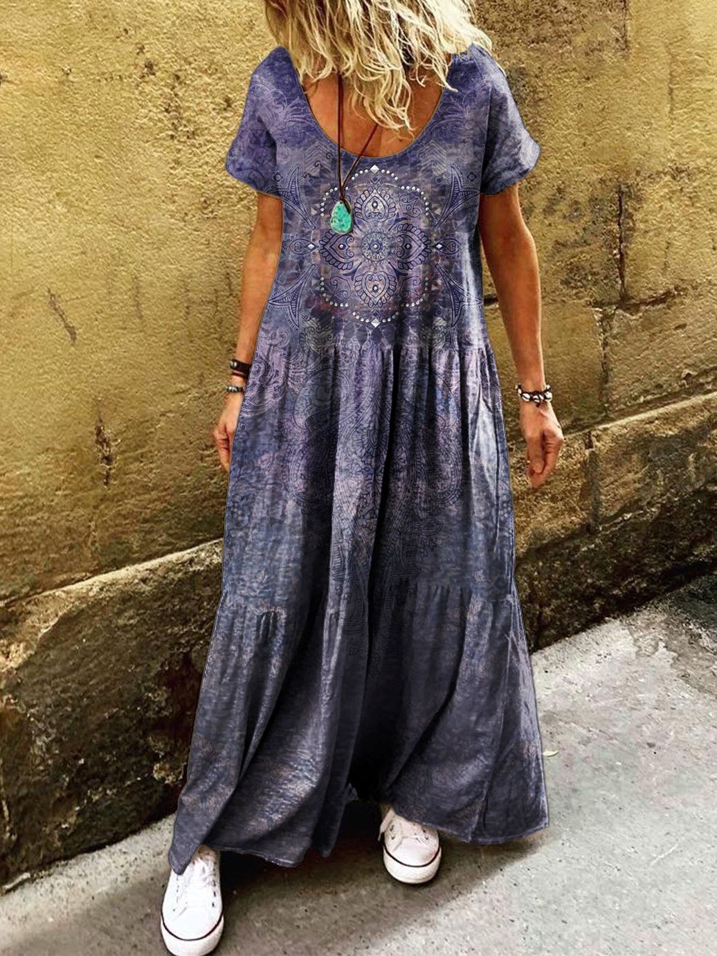 Women's Ethnic Pattern Art Printed Pocket Short Sleeve Cotton Dresses