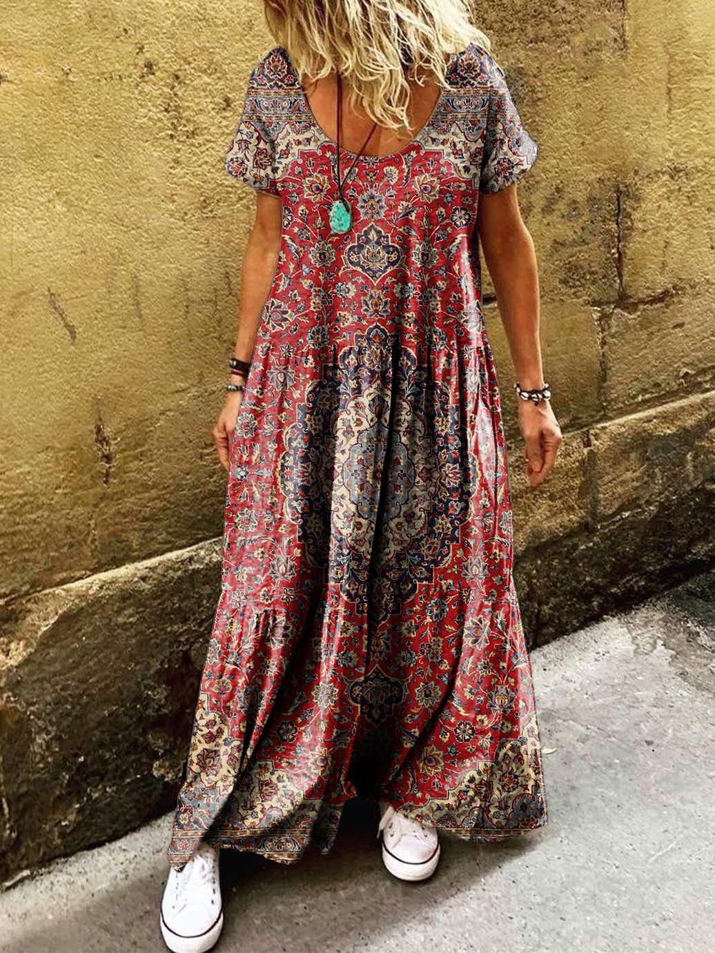 Women's Ethnic Pattern Art Printed Pocket Short Sleeve Cotton Dresses