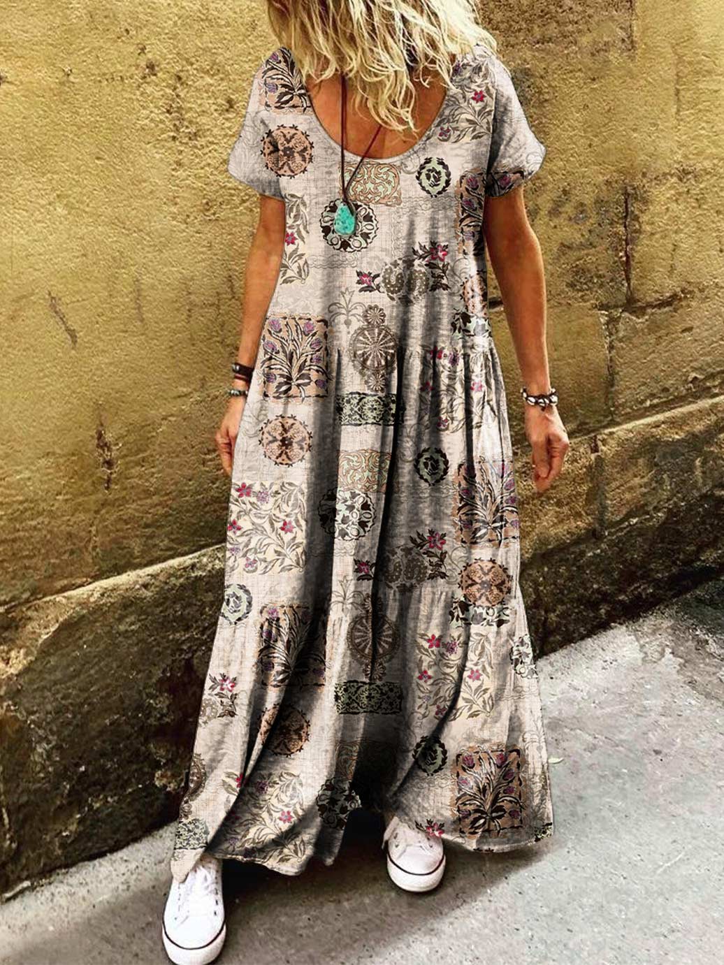 Women's Ethnic Tribal Art Floral Print Round Neck Short Sleeve Dress