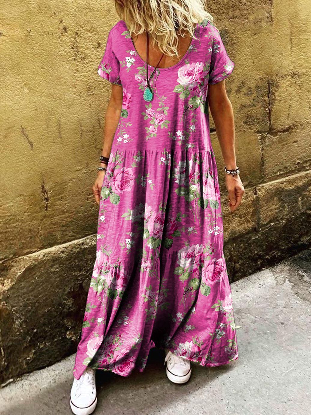 Women's Floral Art Print Pocket Short Sleeve Cotton Dresses