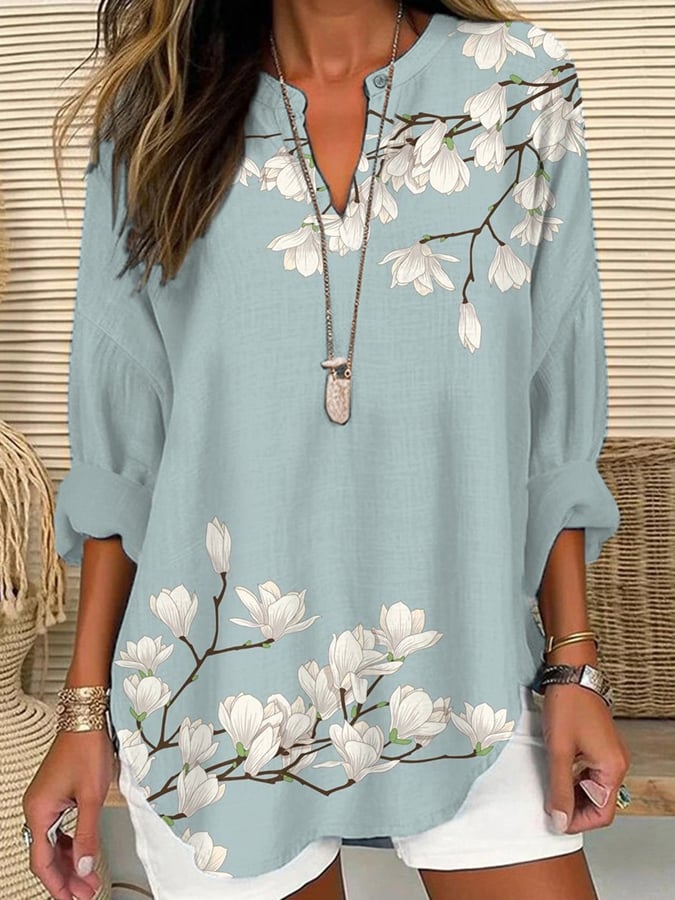 Women's Floral Print Casual Long Sleeve V-Neck Shirt