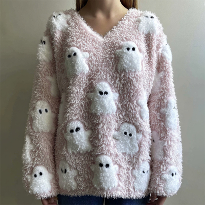 Women's Halloween Cute Ghost Fluffy V-neck Cozy Fuzzy Sweater