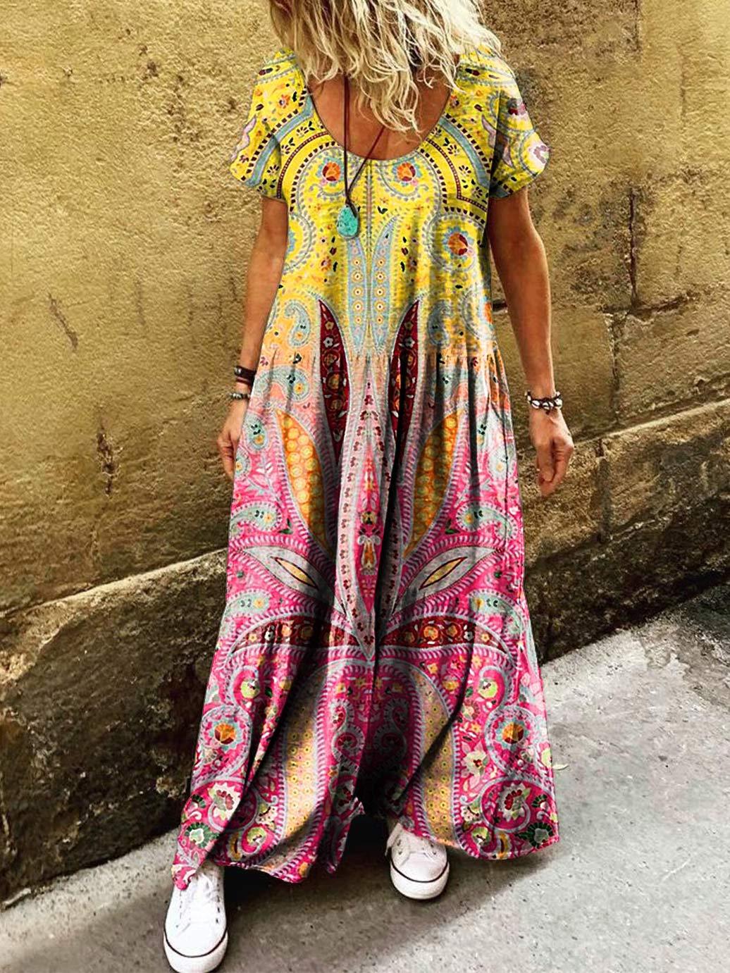 Women's Hippie Art Floral Print Round Neck Short Sleeve Dress