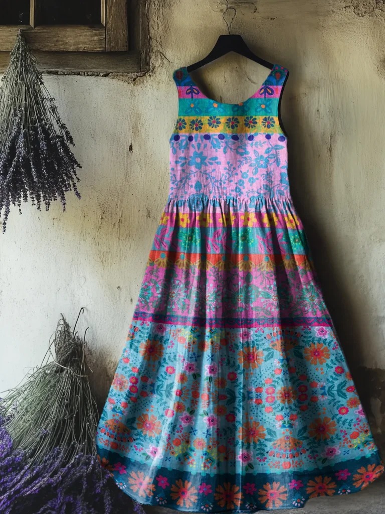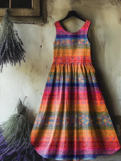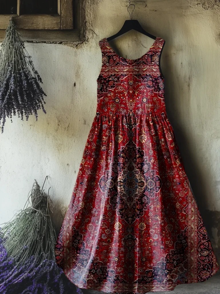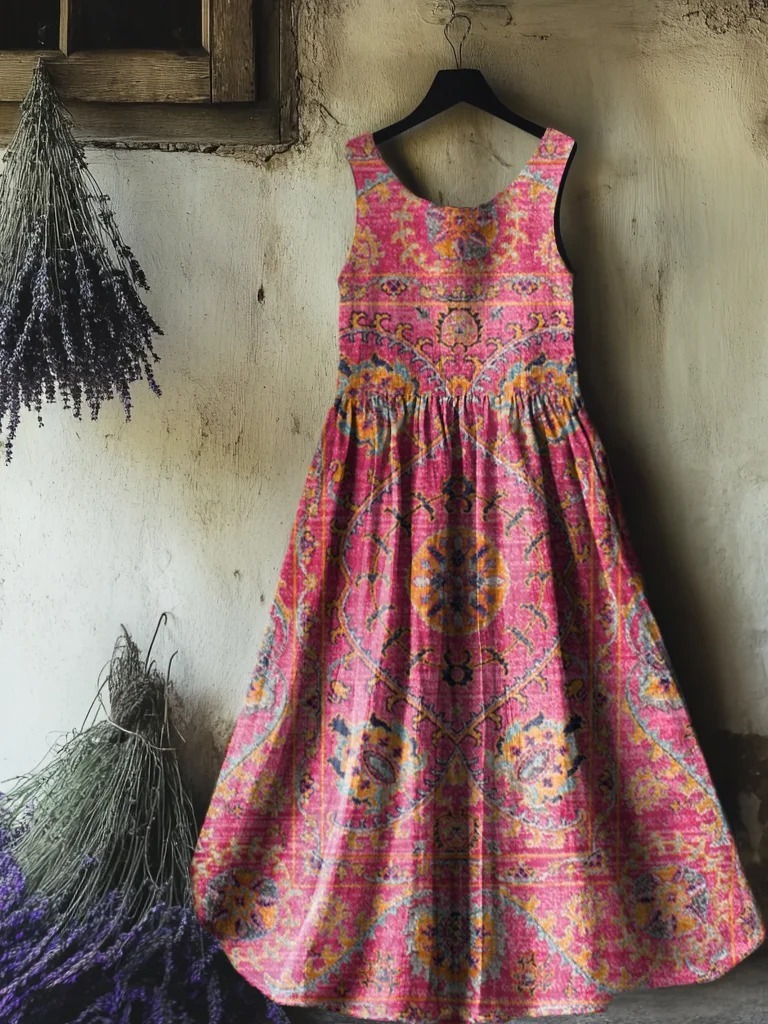 Women's Retro Paisley Floral Art Print Sleeveless Cotton Pocket Dress