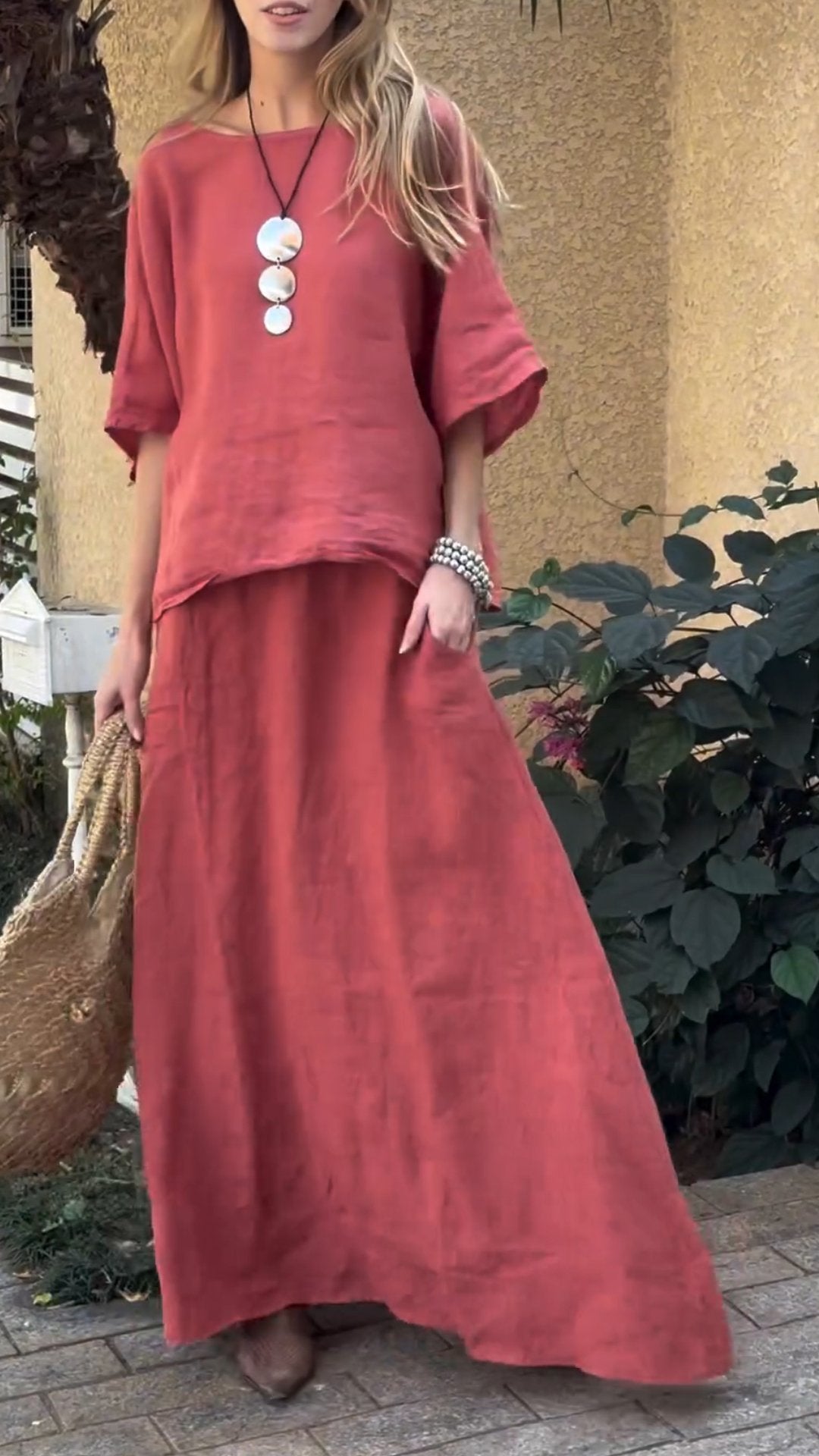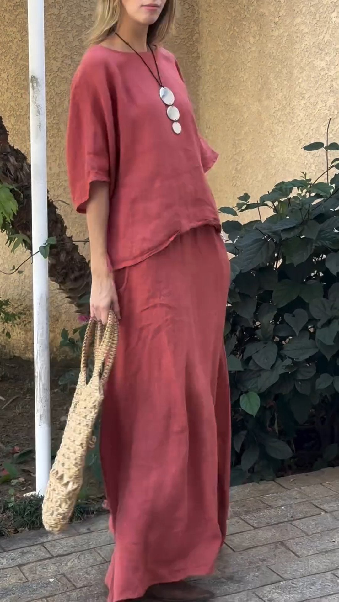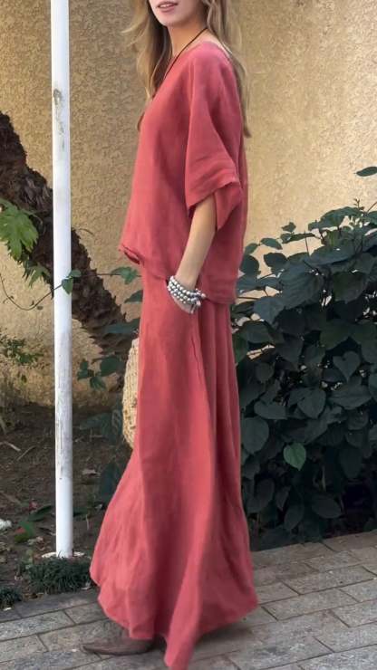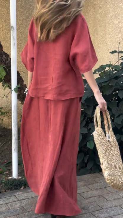 Women's Round Neck Mid-sleeve Cotton and Linen Casual Suit