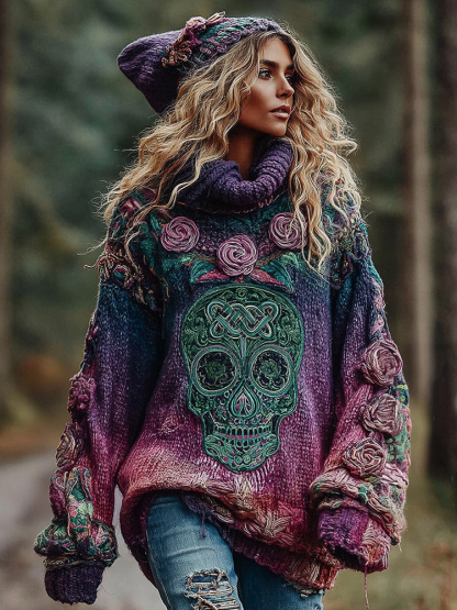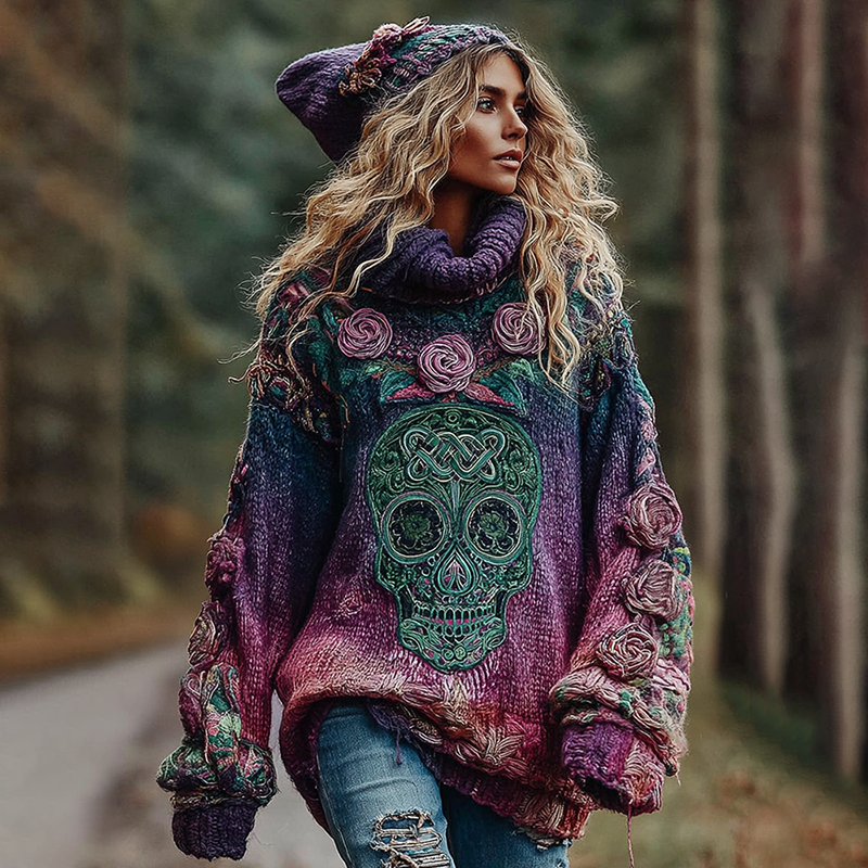 Women's Viking Tribal Jacquard Celtic With Rose And Skull Inspired Chunky Knit Turtleneck Sweater