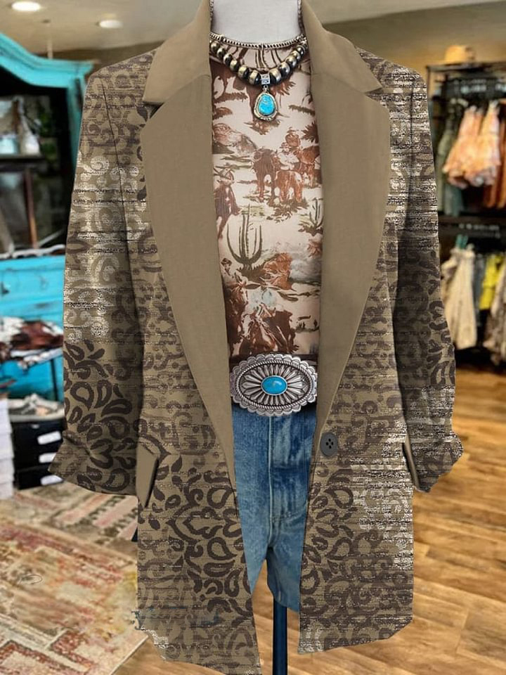 Women's Vintage Brown Floral Texture Print 3/4 Sleeve Casual Blazer
