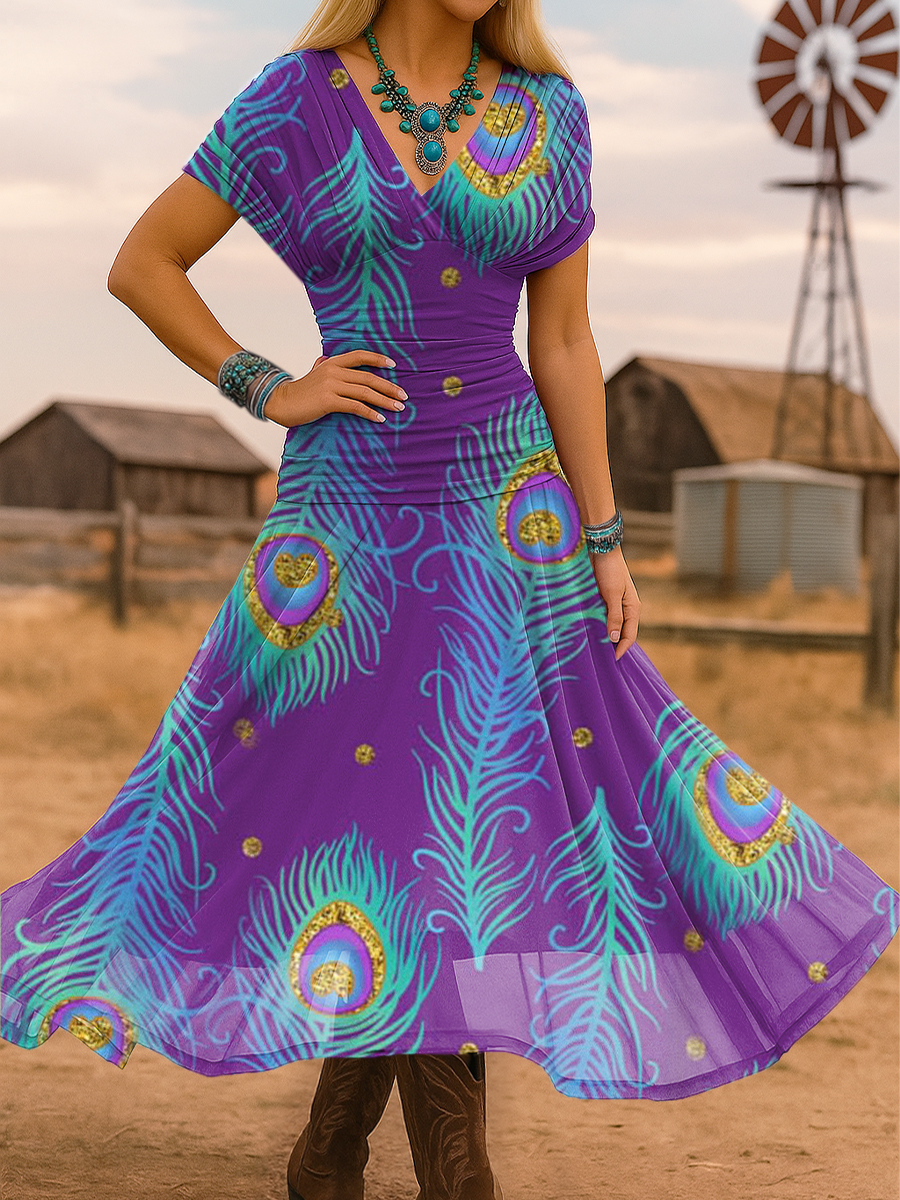 Women's Vintage Feather Print Stretch-mesh Maxi Dress