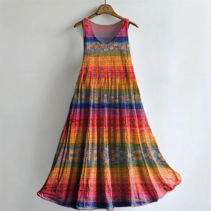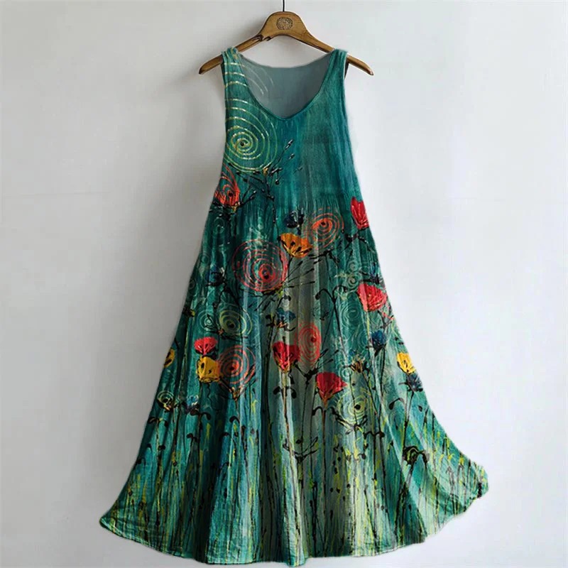 Women's Vintage Floral Art Print Sleeveless Cotton Pocket Dress