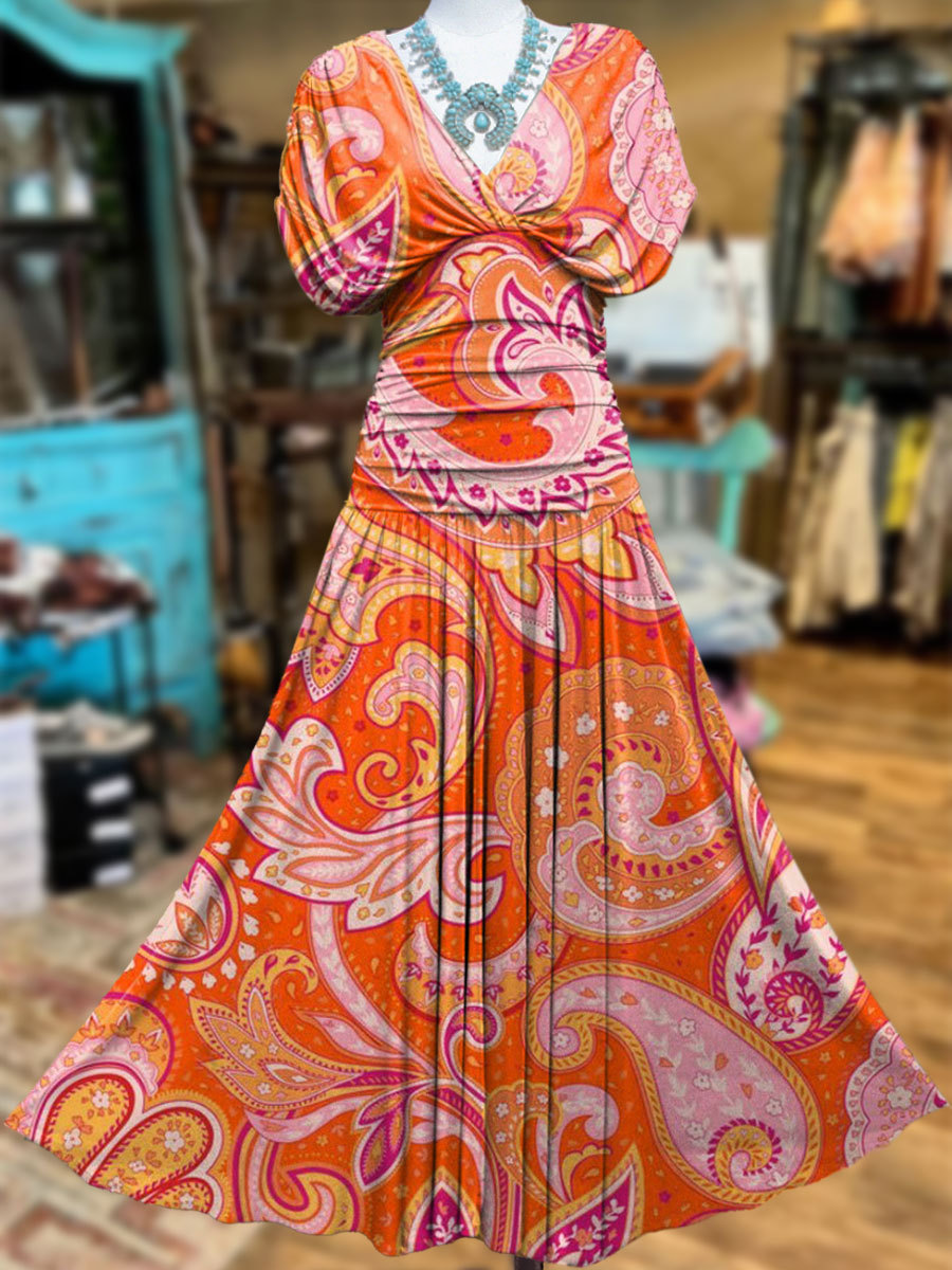 Women's Vintage Paisley Print Stretch-mesh Maxi Dress