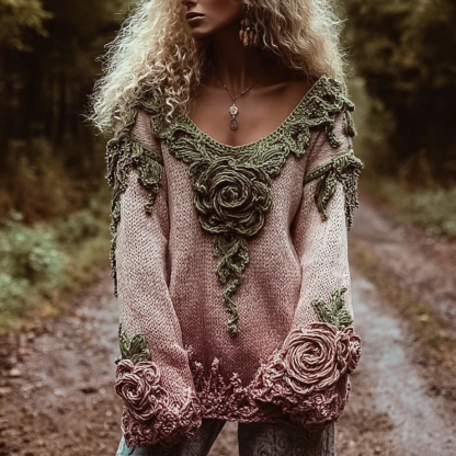 Women's Vintage Rose Embroidery Gradient V-neck Sweater