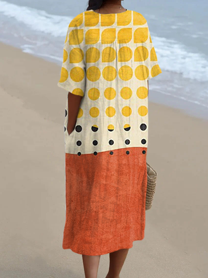 Bohemian Color Block Abstract Polka Dot Art Print V-Neck Midi Dress