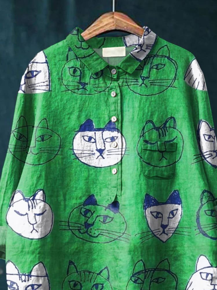 Cat Art Print Casual Cotton And Linen Shirt
