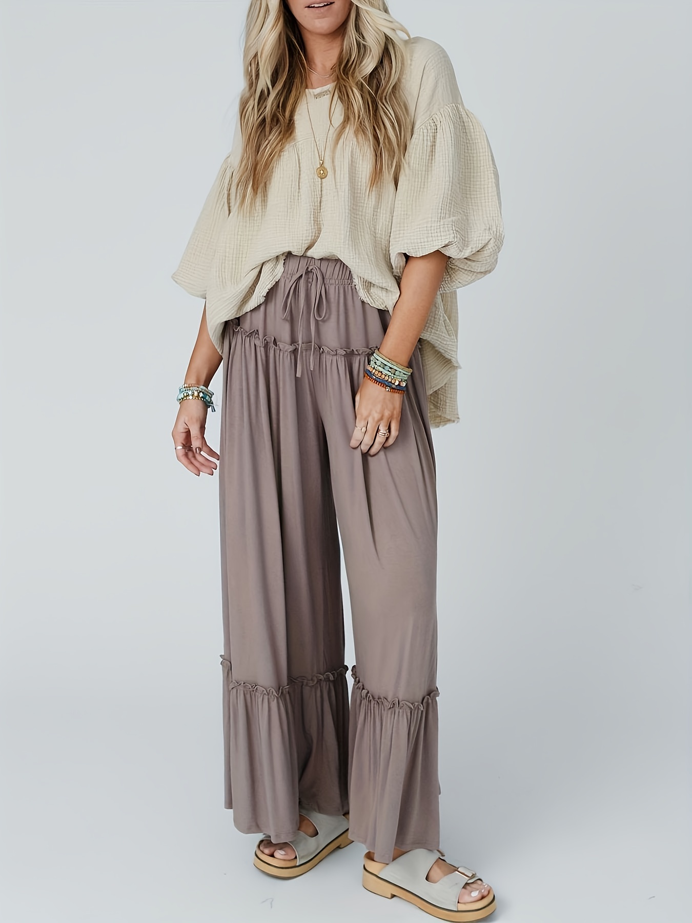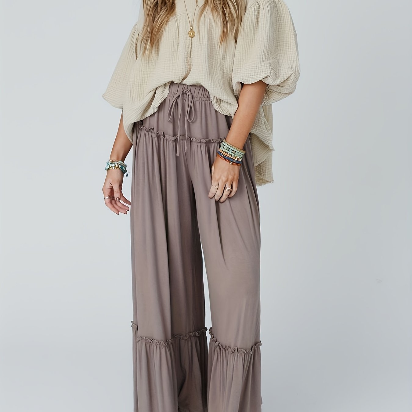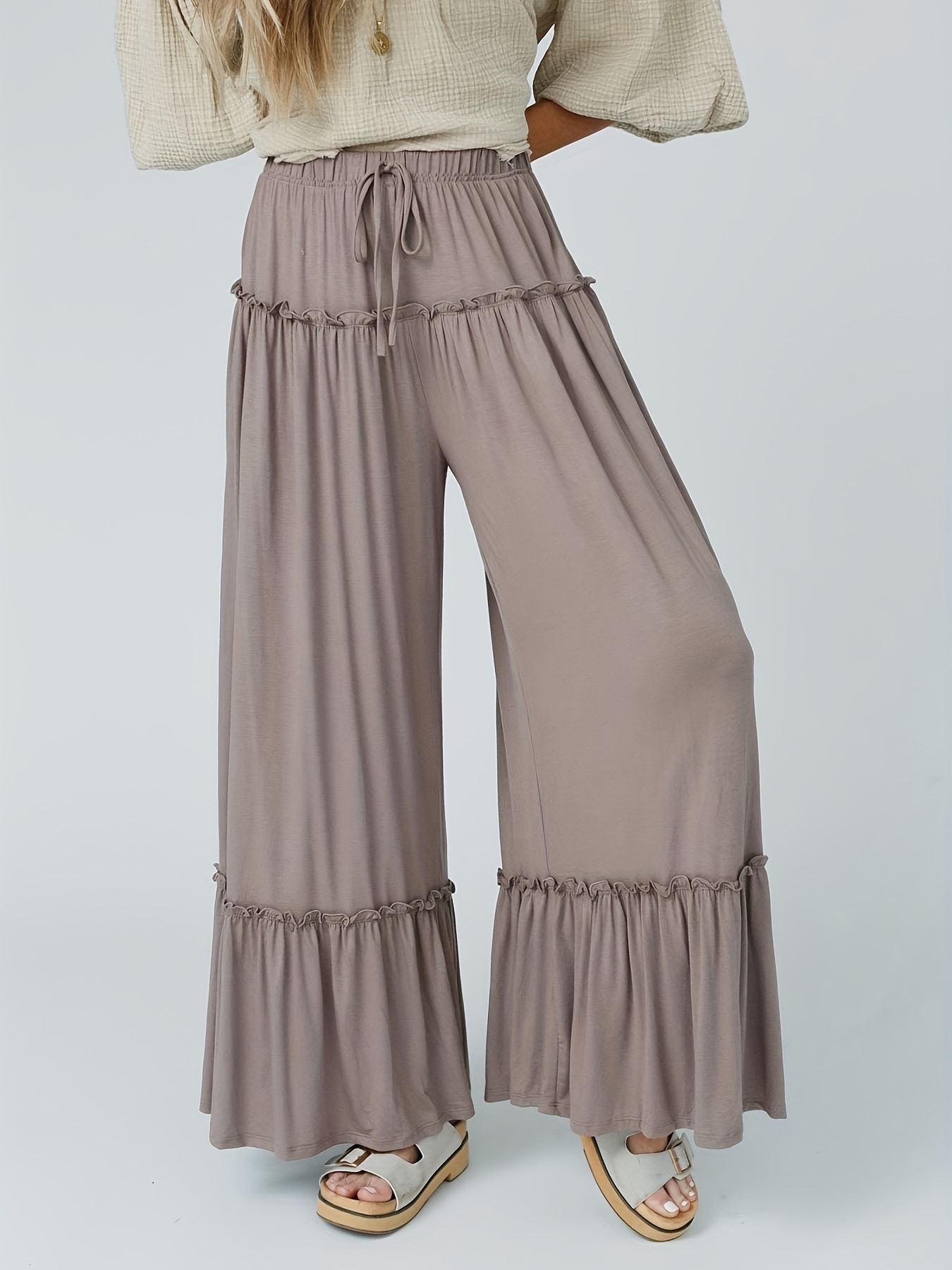 Flirty Ruffle Tiered Wide Leg Pants - Adjustable Drawstring Casual Style - Ultra-Comfort for All Seasons - Effortlessly Chic Womens Clothing
