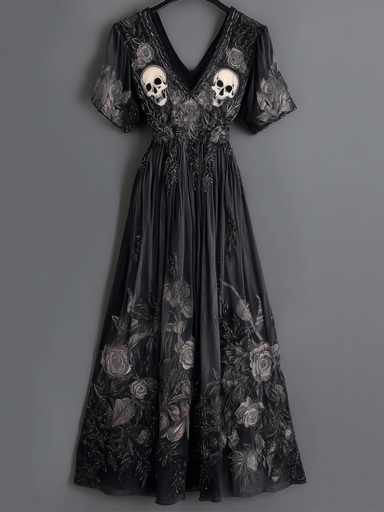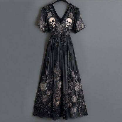 Halloween Skeleton Element V-neck Short Sleeve Dress
