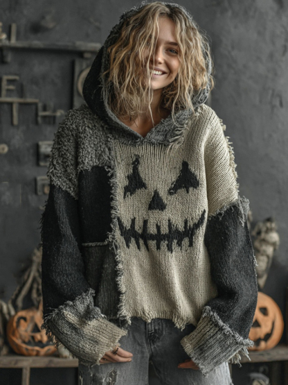 Halloween Spooky Face Contrast Stitched Hooded Cozy Knit Sweater