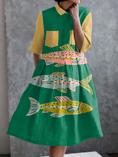 Holiday Ocean Fish Print Casual Pocket Half Sleeve Dress