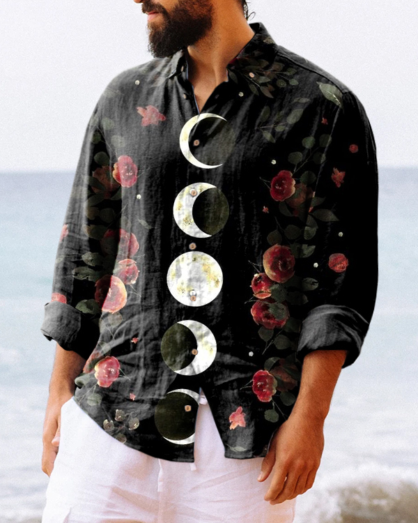 Men's Sun and Moon Floral Print Button-Down Long Sleeve Casual Shirt