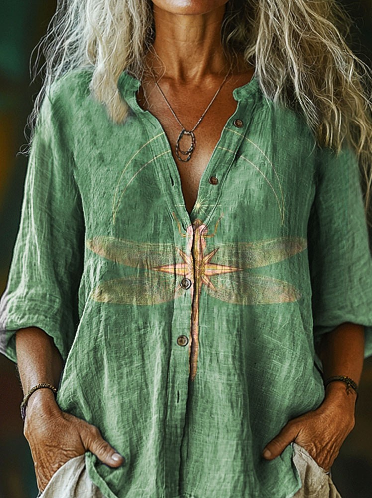 Moon Dragonfly green Women's Print Casual Cotton Linen Shirt