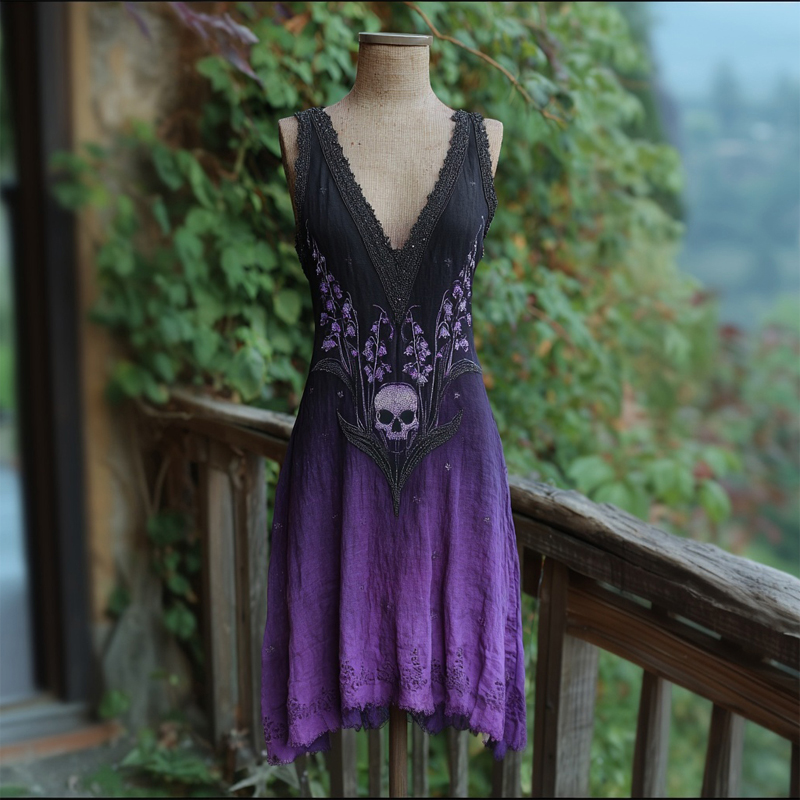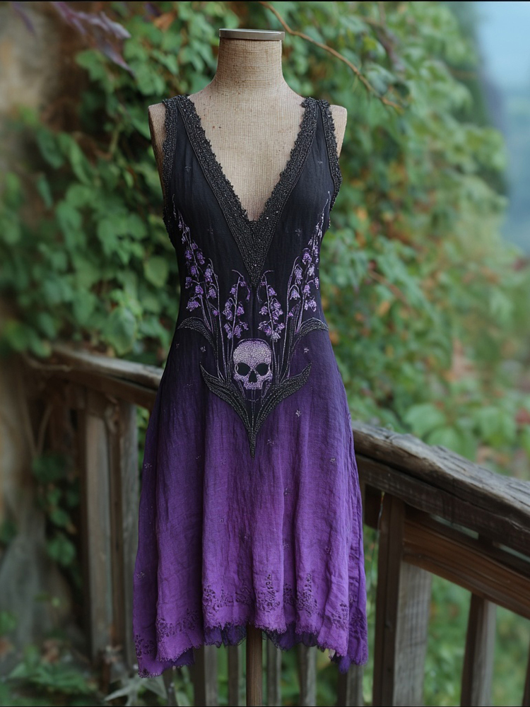 Retro Lily Of The Valley & Skull Embroidered Linen Mini Dress