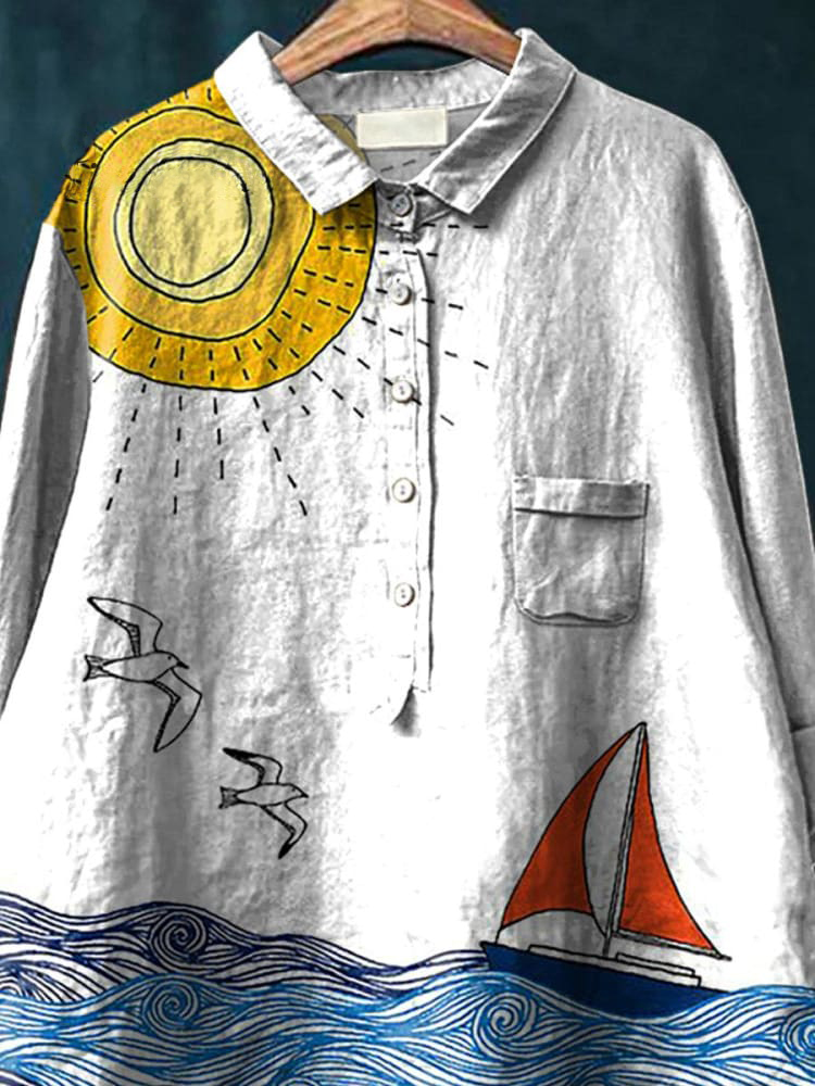 Sailing Little Boat Art Printed Women's Casual Cotton And Linen Shirt