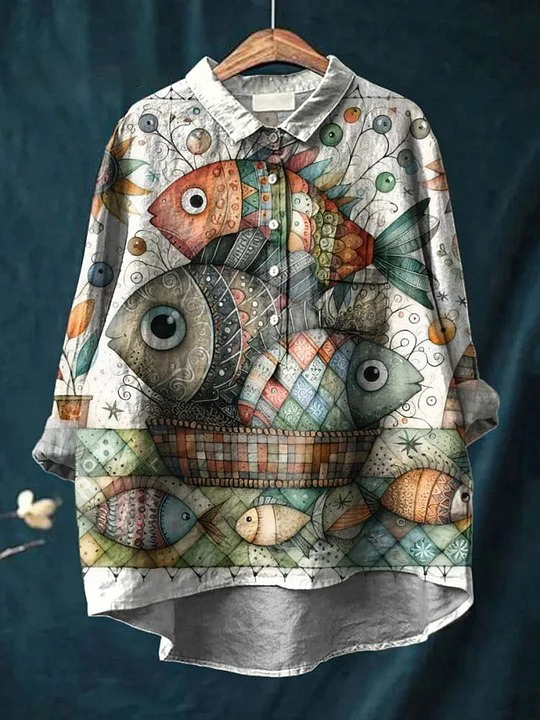 Vintage Cute Fish Art Print Casual Cotton And Linen Shirt