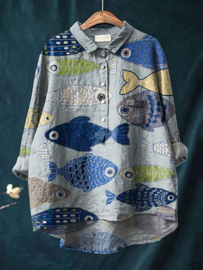 Vintage Lovely Fish Art Print Casual Cotton And Linen Shirt